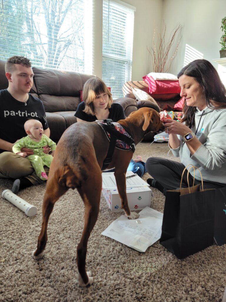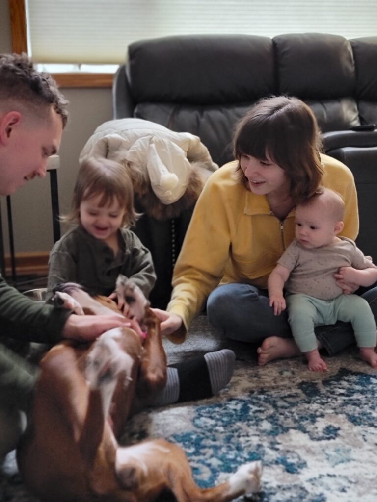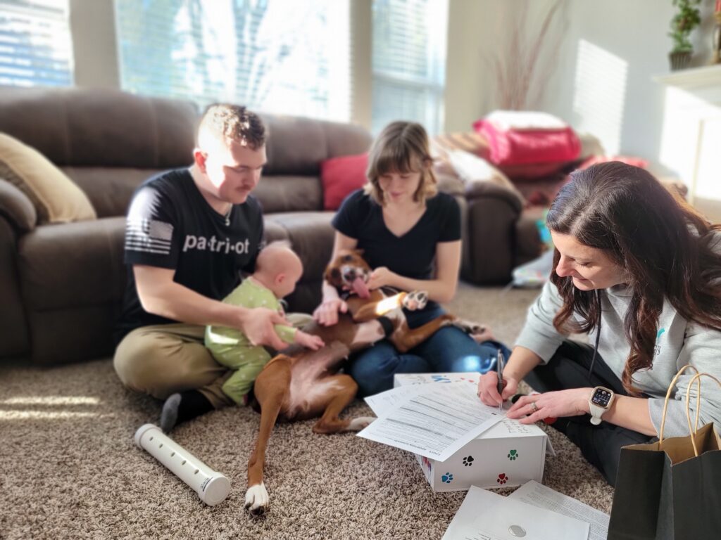 Ana is a 3-year-old, 34-pound mixed-breed female. She may be a boxer mix (look at those socks!), but we can’t say for sure. She was found as a stray in Ross County, where she was a staff favorite before she was brought to Gigi’s. Ana is a delightful and gentle dog who loves to play. Gracie is serving in the Army National Guard and was looking for a hiking buddy to share with her young family. Thank you Wendi for fostering Ana!