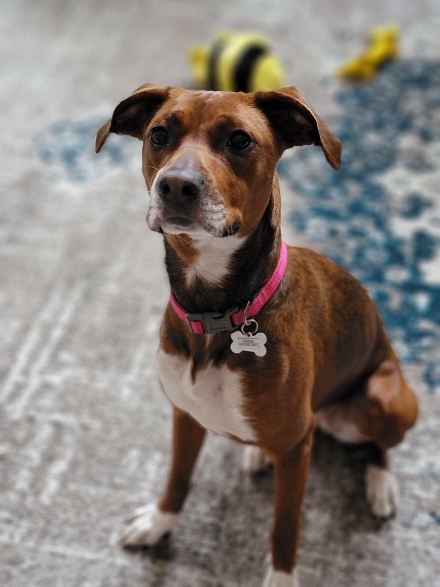 Ana is a 3-year-old, 34-pound mixed-breed female. She may be a boxer mix (look at those socks!), but we can’t say for sure. She was found as a stray in Ross County, where she was a staff favorite before she was brought to Gigi’s. Ana is a delightful and gentle dog who loves to play. Gracie is serving in the Army National Guard and was looking for a hiking buddy to share with her young family. Thank you Wendi for fostering Ana!