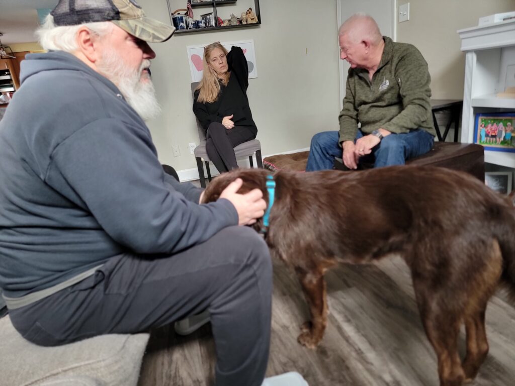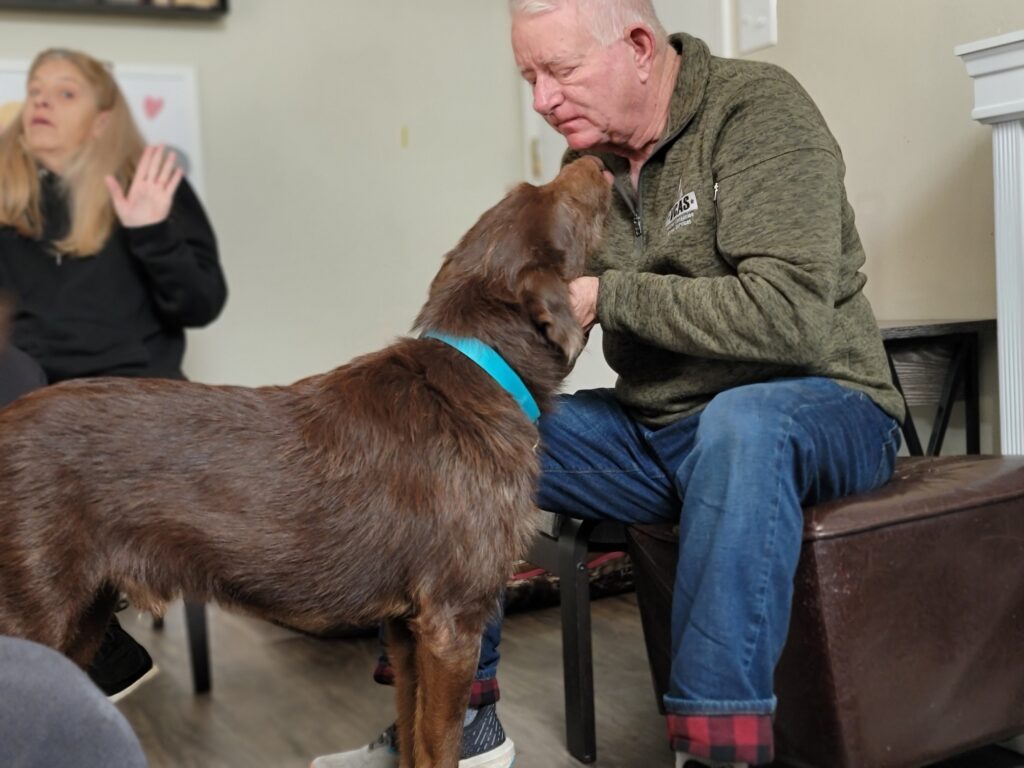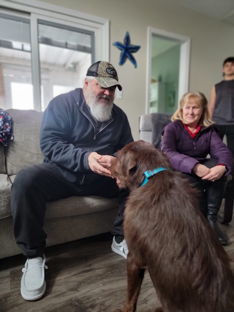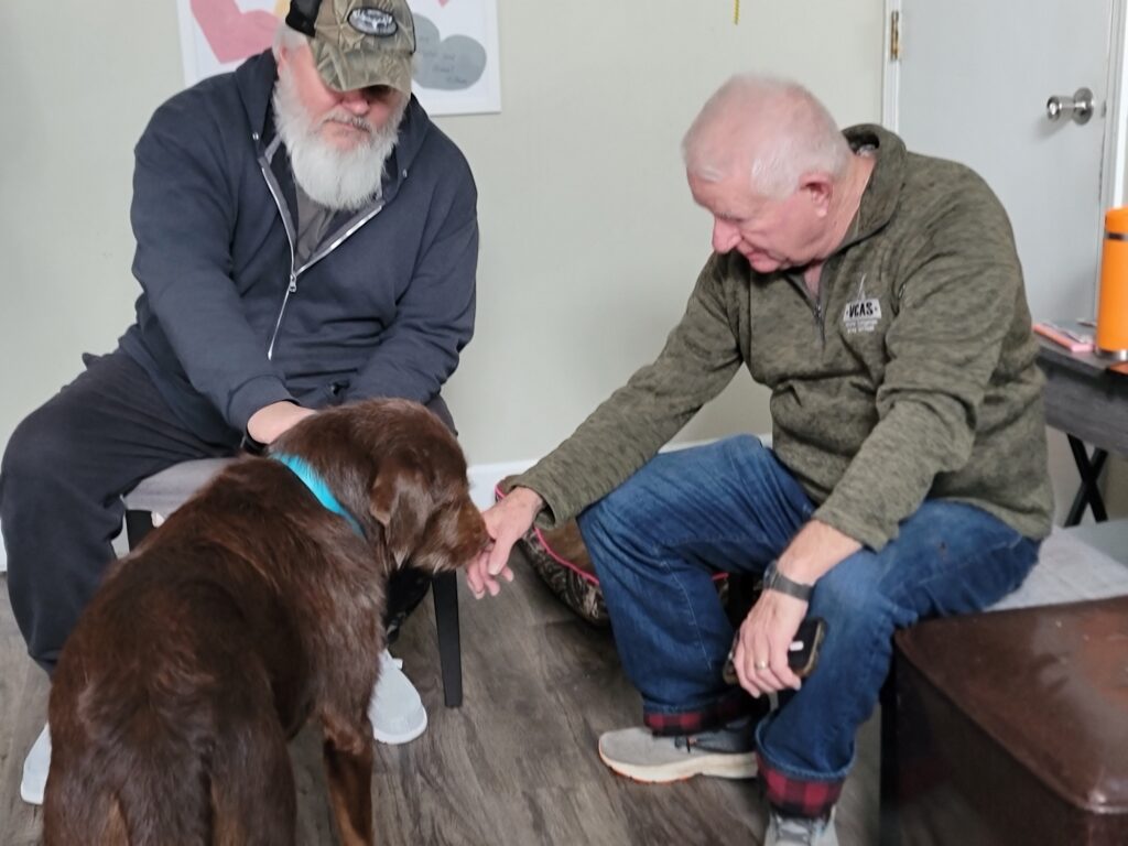 You may recognize my new dad, Mark Harris. He is an Air Force and Army National Guard veteran who came to VCAS in 2020 looking for a dog and adopted Winston, an Anatolian Shepherd mix. They were a wonderful match and his calmness was very helpful to Mark. Unfortunately, after being great companions for a couple of years, Winston was stricken with cancer and passed away.