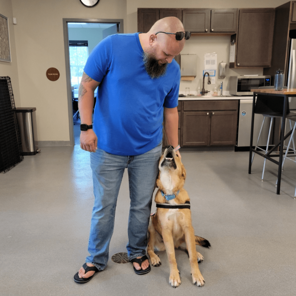 I am calm, but perk up when a walk is involved. I’m happy to greet anyone, and can’t wait to be the best buddy for my dad, Brent!